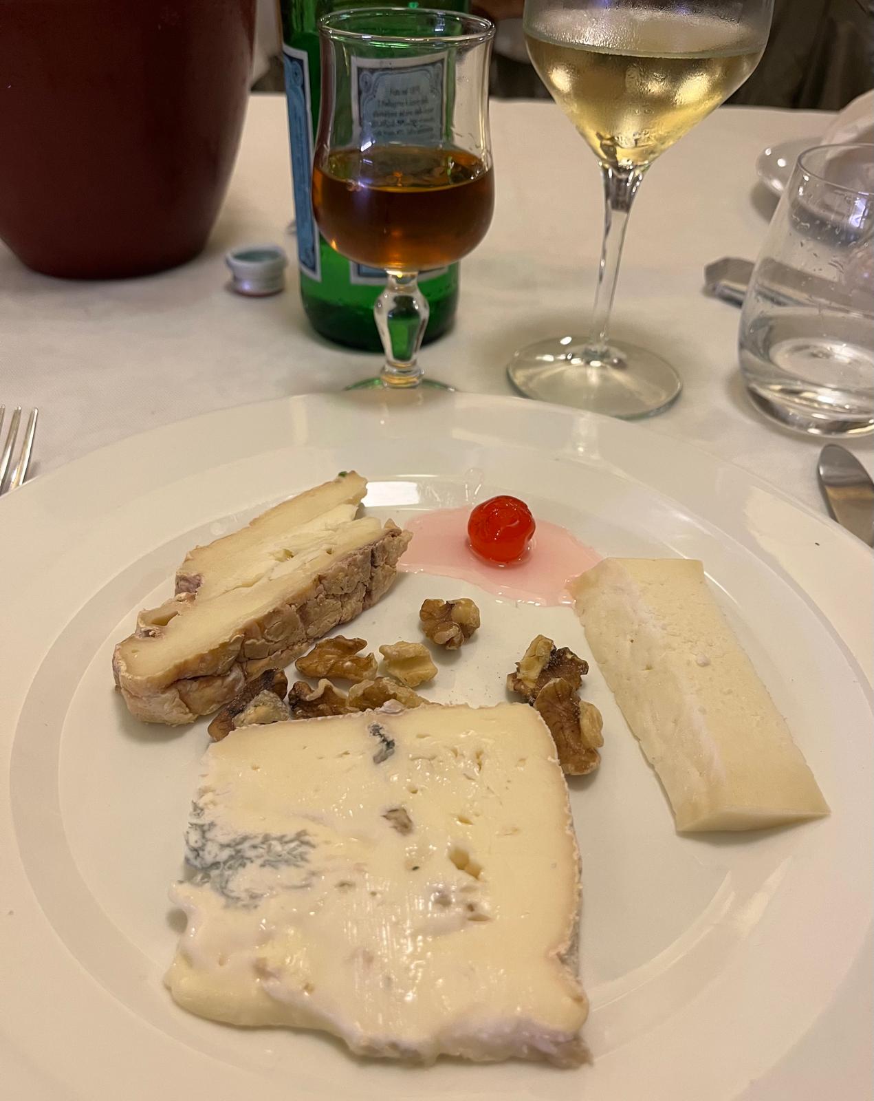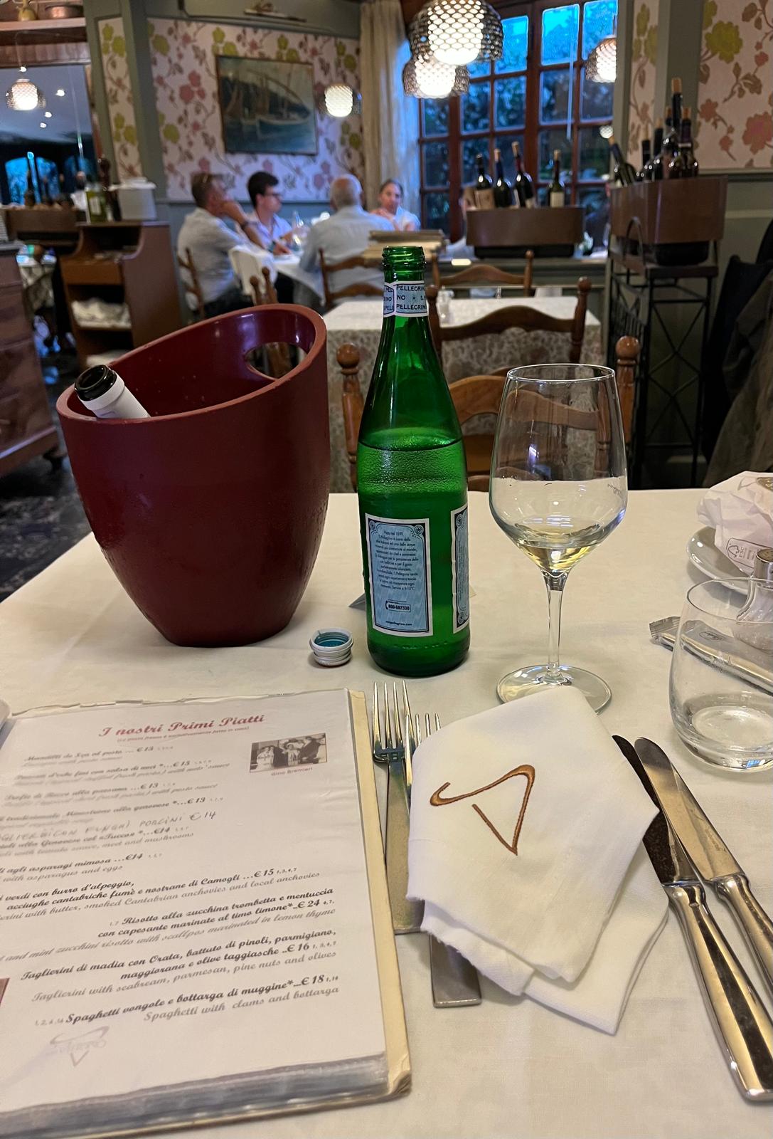 Sono arrivata lì quindi, davanti all’imponente balcone della reception e subito mi hanno fatto sedere e proposto l’acqua. Inizia lì la meraviglia del momento. Io che scruto ogni dettaglio, parete, cameriere, tavolo, ospite. I camerieri sembrano ballare un valzer; leggeri, attivi, discreti, eleganti. Il menù propone un’ampia proposta di specialità liguri e anche il vino è locale. E’ un sabato sera di fine settimana lungo e la gente sembra felice e leggera e solo questa visione mi rende felice anche io. Non potevo non iniziare le festività con l’antipasto sicuramente più mitico del ristorante; la focaccia col formaggio di Recco IGP, fatta in casa. Portata in un piatto ottagonale dall’atemporale eleganza, arrivata bella calda, con il formaggio filante, era squisita. Mi faccio consigliare per il primo; dei taglierini verdi con burro d’alpeggio, acciughe cantabriche fumè e nostrane di Camogli. Una meraviglia di delicatezza, di sapori fini e genuini. Abbinati con un Vermentino fresco sono affascinata dal momento e dalla degustazione. Io che adoro le cene solitarie, stasera mi voglio proprio godere tutto del momento. Credo che ogni mio boccone fosse accompagnato da un mio sorriso. Come spesso succede, ho proseguito e concluso con l’assaggio di formaggi. Erano in tre, tre meravigliosi formaggi regionali, con ciascuno un profilo distintivo dagli altri, serviti con un calice di passito e una mostarda di ciliegina. Favoloso… Caffè, come da tradizione… e un mirto offerto dal proprietario, preso al bar. Ero senza parole, era stato tutto perfetto – succede, tristemente, sempre più raramente da essere notato – , ben oltre le mie aspettative, portavo con me il ricordo indimenticabile di un posto che mi aveva accolta, curata, dato tanti piaceri, dall’inizio fino alla fine. Sapevo già che Da O Vittorio sarebbe stato un posto in cui avrei voluto tornare già appena uscita dal locale.