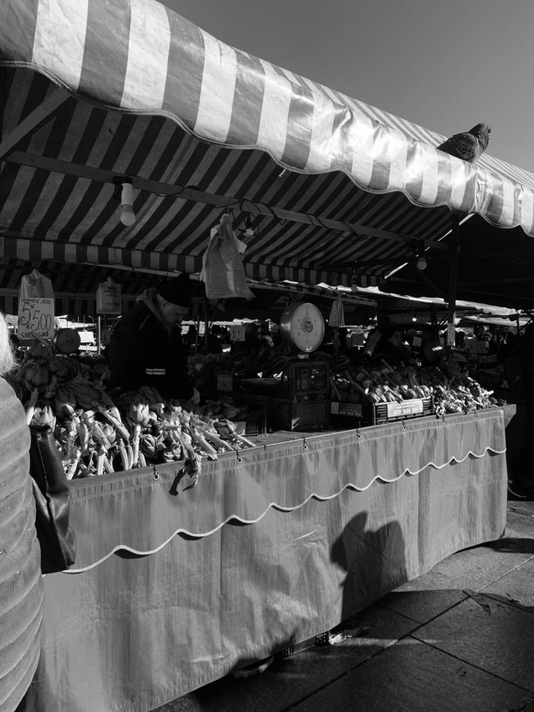 Per alcuni, questo rituale va di pari con il periodo di ferie, quando il ritmo rallenta e che ci “autorizziamo” a tornare a prendere il tempo. Per altri, è un’abitudine da sempre, un appuntamento fisso che viene ripetuto ogni settimana e negli anni. Credo che in ogni caso sia un momento sinonimo di gioia, interazioni sociali e golosità. Penso anche a quelli che restano al mercato per ore, solo per il piacere di vivere il luogo la mattina intera, perché si succedono più atmosfere, perché è un luogo vivo e bello per la vita che racchiude dentro di sé. Si incontrano amici, conoscenze, ci si ferma al bar per un caffè e forse anche alla fine del mercato per un aperitivo. Per me è l’illustrazione perfetta di una “cité heureuse“, che va oltre le differenze sociali, economiche, demografiche e che raggruppa tutte e tutti senza fare distinzioni. E’ l’illustrazione di una piccola società di essere umani che per un momento mettono da parte la loro quotidianità, le contrarietà, i problemi più seri, lo stress, il sovrappensiero, per lasciarsi immergere in questo piccolo mondo affascinante. Fa bene all’anima finalmente lasciarsi andare ad un po’ di leggerezza e di senso di comunione.