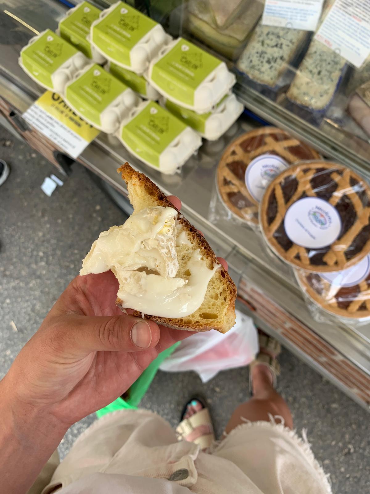 Poi, c’è la vita, l’animazione, le grida dei commercianti che invitano a degustare i loro prodotti. Amo in particolare quei mercati un po’ popolari in cui si sente battere il cuore di un quartiere. I vecchietti con i carelli, le famiglie con i bimbi, chi torna dallo sport ancora in tuta che si ferma a fare un po’ di spesa… Ed io che osservo tutta questa vita attorno a me, oltre alle eccellenze che ci circondano. Non faccio mai una lista delle cose che mi servono, so che ho bisogno di frutta e verdura e magari di un po’ di formaggio, frutta secca o pane; preferisco lasciarmi ispirare da quel che vedo, da quel che il mio stomaco mi chiede. E’ tutto più spontaneo e entusiasmante perché si compra con una gran voglia, spesso immediata di queste melanzane belle tonde, di queste pere arrivate a piena maturità, di provare quel pane con un grano speciale. Sono anche tornata a comprare il pollo all’arrosto che non mangiavo più da anni e che sa sempre di pranzi domenicali in famiglia. C’è poi il pastaio con un’ampia proposta di ravioli riempiti con sapori dai più tradizionali a quelli più fantasiosi. Ci stupiamo sempre della qualità alta di ciò che assaggiamo, dalla freschezza degli ingredienti. E’ come ritrovare i sapori antichi, di quelli veri e genuini che scaldano in un attimo i cuori.